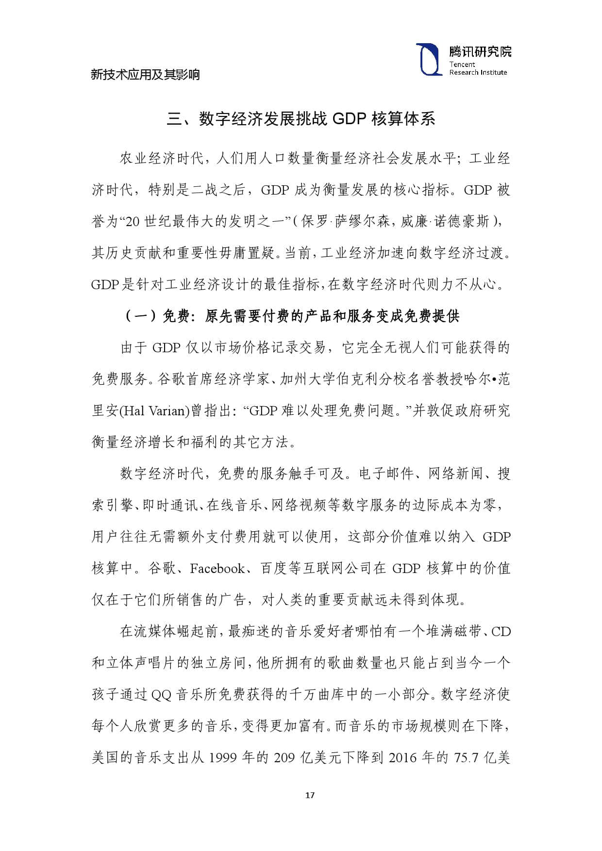 由于 GDP 仅以市场价格记录交易,它完全无视人们可能获得的 免费服务。谷歌首席经济学家、加州大学伯克利分校名誉教授哈尔•范 里安(Hal Varian)曾指出:“GDP 难以处理免费问题。”并敦促政府研究 衡量经济增长和福利的其它方法。