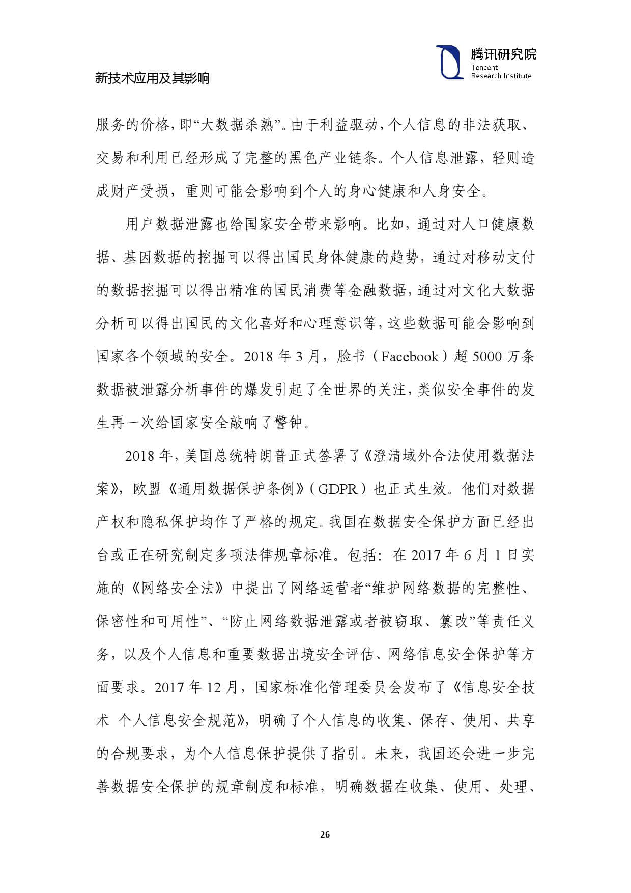 2018年,美国总统特朗普正式签署了《澄清域外合法使用数据法 案》,欧盟《通用数据保护条例》(GDPR)也正式生效。他们对数据 产权和隐私保护均作了严格的规定。我国在数据安全保护方面已经出 台或正在研究制定多项法律规章标准。包括:在 2017 年 6 月 1 日实 施的《网络安全法》中提出了网络运营者“维护网络数据的完整性、 保密性和可用性”、“防止网络数据泄露或者被窃取、篡改”等责任义 务,以及个人信息和重要数据出境安全评估、网络信息安全保护等方 面要求。2017年 12 月,国家标准化管理委员会发布了《信息安全技 术 个人信息安全规范》,明确了个人信息的收集、保存、使用、共享 的合规要求,为个人信息保护提供了指引。未来,我国还会进一步完 善数据安全保护的规章制度和标准,明确数据在收集、使用、处理、交易、出境等各环节的安全要求,加强数据资源的监督管理和风险评 估,提升数据保护能力,为数字经济发展保驾护航。