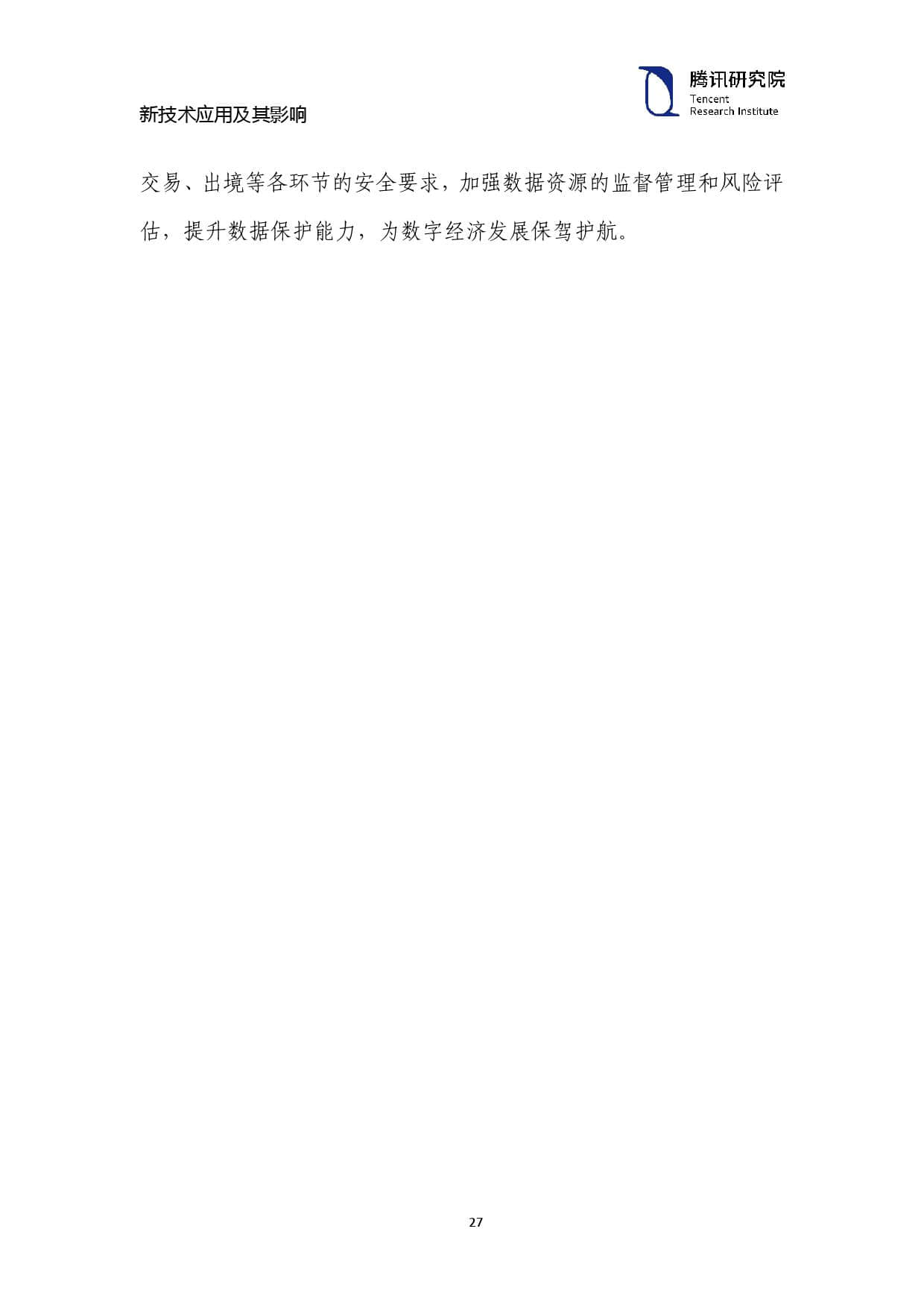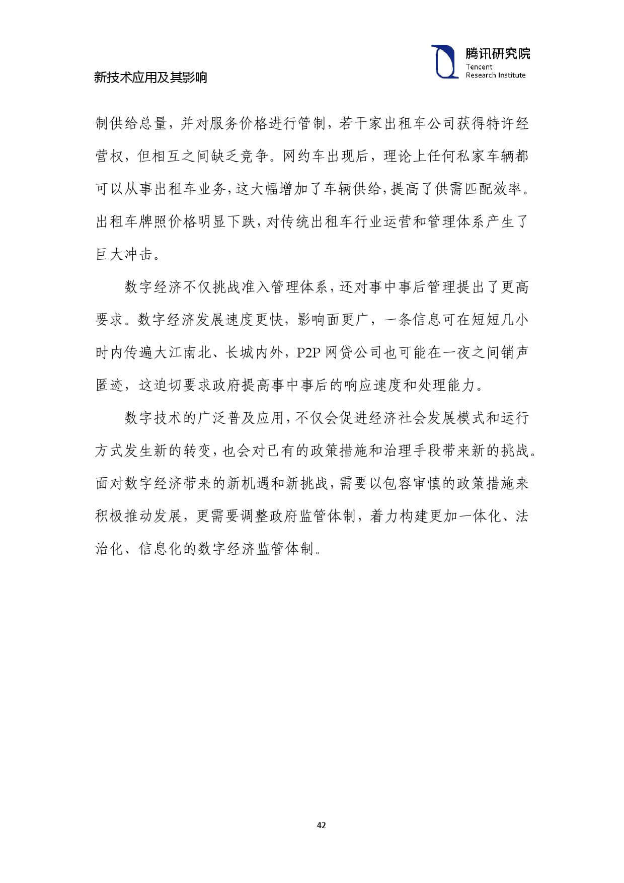 数字技术的广泛普及应用,不仅会促进经济社会发展模式和运行 方式发生新的转变,也会对已有的政策措施和治理手段带来新的挑战。 面对数字经济带来的新机遇和新挑战,需要以包容审慎的政策措施来 积极推动发展,更需要调整政府监管体制,着力构建更加一体化、法 治化、信息化的数字经济监管体制。