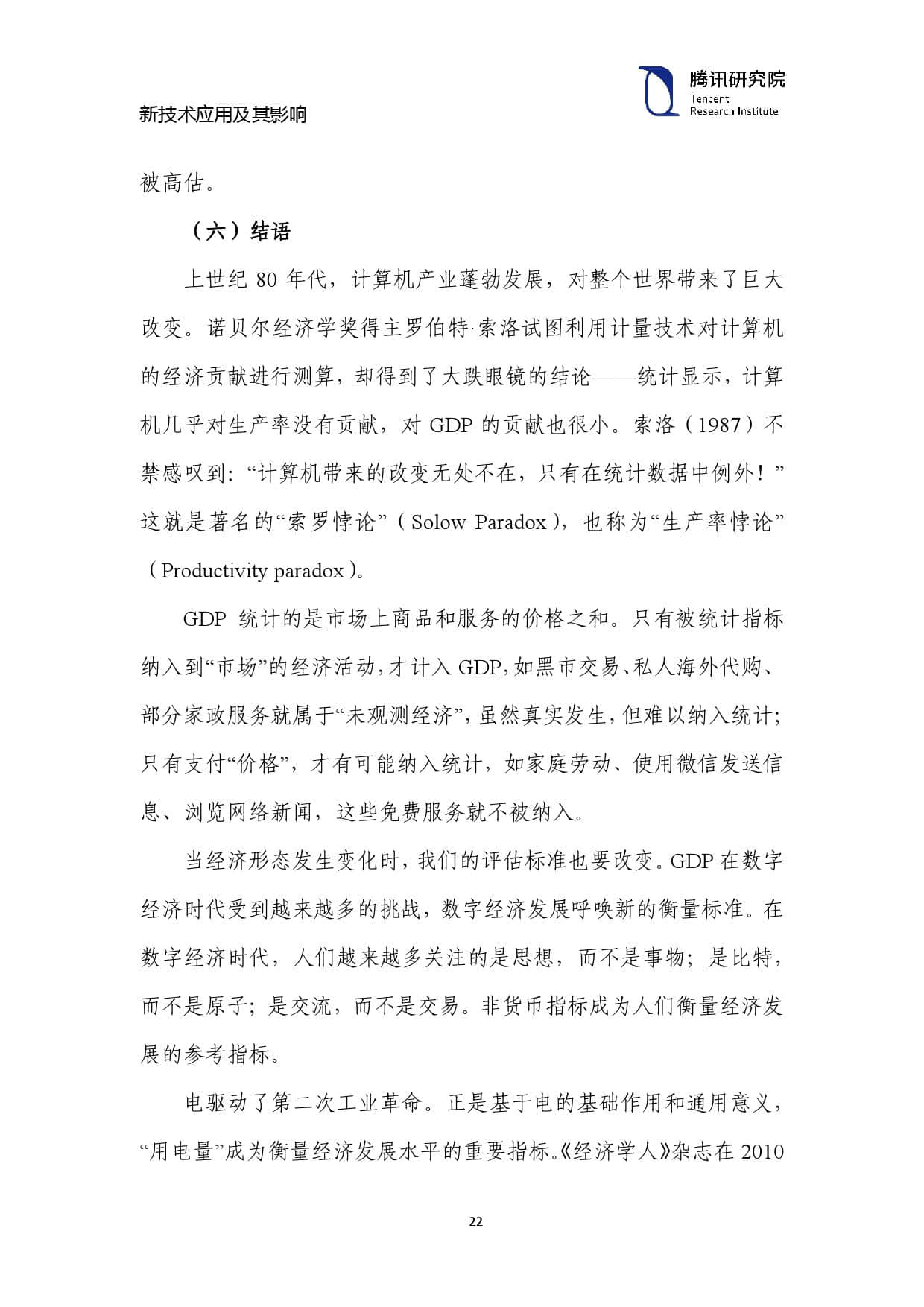 上世纪 80 年代,计算机产业蓬勃发展,对整个世界带来了巨大 改变。诺贝尔经济学奖得主罗伯特·索洛试图利用计量技术对计算机 的经济贡献进行测算,却得到了大跌眼镜的结论——统计显示,计算 机几乎对生产率没有贡献,对 GDP 的贡献也很小。索洛(1987)不 禁感叹到:“计算机带来的改变无处不在,只有在统计数据中例外!” 这就是著名的“索罗悖论”(Solow Paradox),也称为“生产率悖论” (Productivity paradox)。