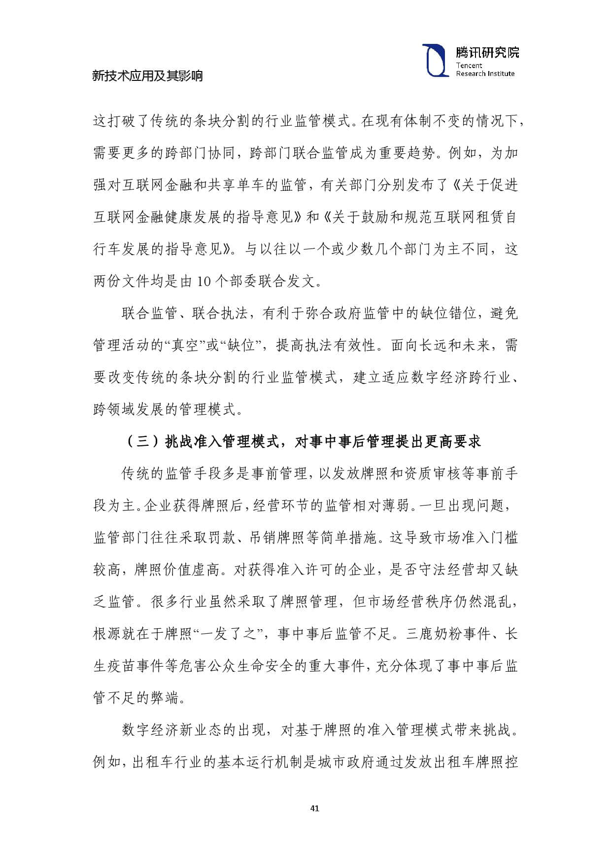 这打破了传统的条块分割的行业监管模式。在现有体制不变的情况下, 需要更多的跨部门协同,跨部门联合监管成为重要趋势。例如,为加 强对互联网金融和共享单车的监管,有关部门分别发布了《关于促进 互联网金融健康发展的指导意见》和《关于鼓励和规范互联网租赁自 行车发展的指导意见》。与以往以一个或少数几个部门为主不同,这 两份文件均是由 10 个部委联合发文。