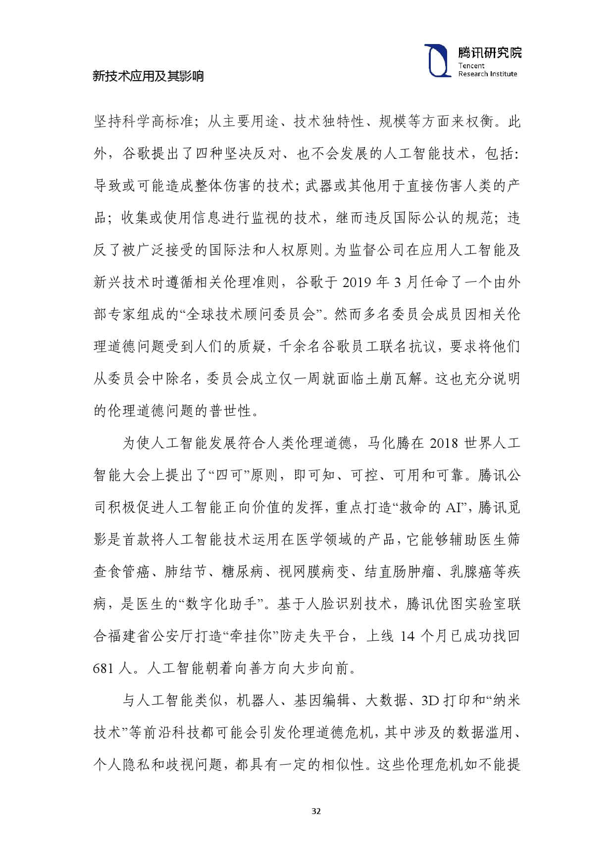 为使人工智能发展符合人类伦理道德,马化腾在2018世界人工 智能大会上提出了“四可”原则,即可知、可控、可用和可靠。腾讯公 司积极促进人工智能正向价值的发挥,重点打造“救命的 AI”,腾讯觅 影是首款将人工智能技术运用在医学领域的产品,它能够辅助医生筛 查食管癌、肺结节、糖尿病、视网膜病变、结直肠肿瘤、乳腺癌等疾 病,是医生的“数字化助手”。基于人脸识别技术,腾讯优图实验室联 合福建省公安厅打造“牵挂你”防走失平台,上线 14 个月已成功找回 681 人。人工智能朝着向善方向大步向前。