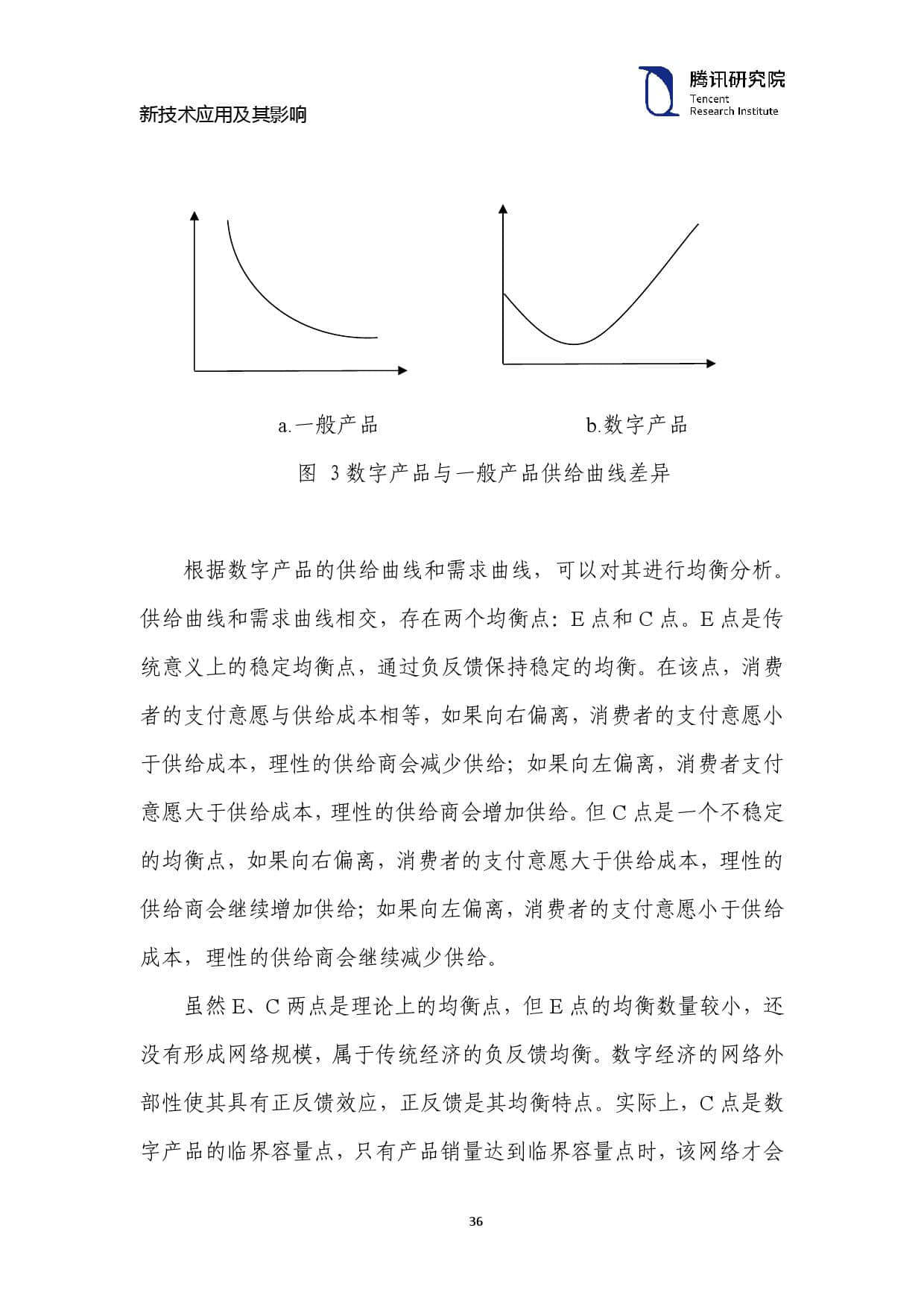 根据数字产品的供给曲线和需求曲线,可以对其进行均衡分析。 供给曲线和需求曲线相交,存在两个均衡点:E 点和 C 点。E 点是传 统意义上的稳定均衡点,通过负反馈保持稳定的均衡。在该点,消费 者的支付意愿与供给成本相等,如果向右偏离,消费者的支付意愿小 于供给成本,理性的供给商会减少供给;如果向左偏离,消费者支付 意愿大于供给成本,理性的供给商会增加供给。但 C 点是一个不稳定 的均衡点,如果向右偏离,消费者的支付意愿大于供给成本,理性的 供给商会继续增加供给;如果向左偏离,消费者的支付意愿小于供给 成本,理性的供给商会继续减少供给。