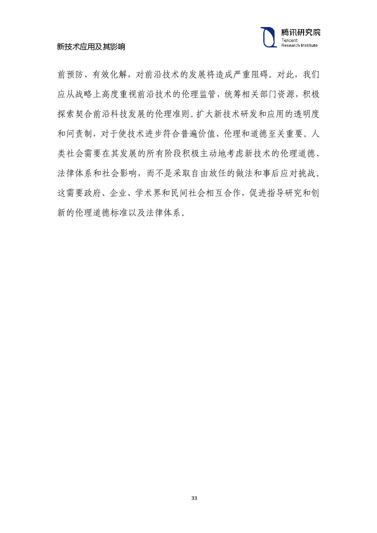 与人工智能类似,机器人、基因编辑、大数据、3D 打印和“纳米 技术”等前沿科技都可能会引发伦理道德危机,其中涉及的数据滥用、 个人隐私和歧视问题,都具有一定的相似性。这些伦理危机如不能提前预防、有效化解,对前沿技术的发展将造成严重阻碍。对此,我们 应从战略上高度重视前沿技术的伦理监管,统筹相关部门资源,积极 探索契合前沿科技发展的伦理准则。扩大新技术研发和应用的透明度 和问责制,对于使技术进步符合普遍价值、伦理和道德至关重要。人 类社会需要在其发展的所有阶段积极主动地考虑新技术的伦理道德、 法律体系和社会影响,而不是采取自由放任的做法和事后应对挑战。 这需要政府、企业、学术界和民间社会相互合作,促进指导研究和创 新的伦理道德标准以及法律体系。