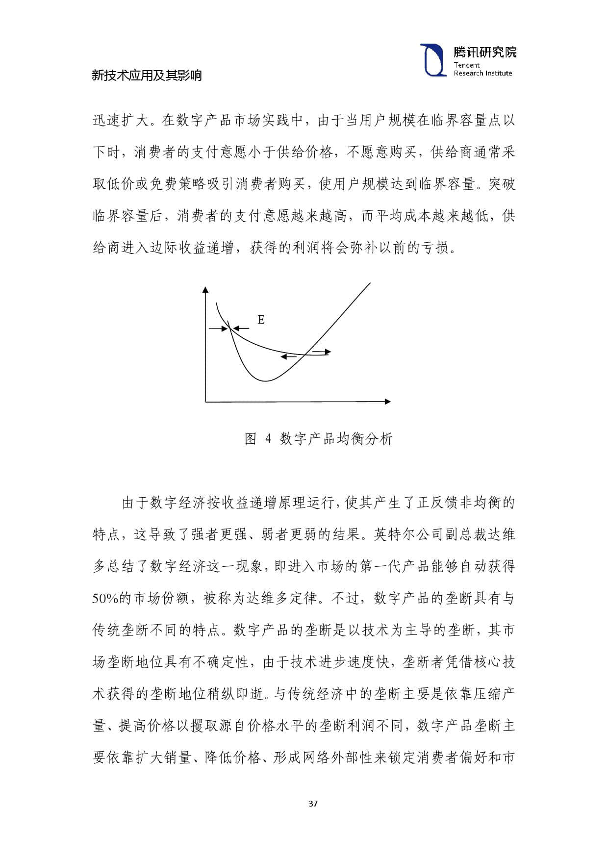 虽然 E、C 两点是理论上的均衡点,但 E 点的均衡数量较小,还 没有形成网络规模,属于传统经济的负反馈均衡。数字经济的网络外 部性使其具有正反馈效应,正反馈是其均衡特点。实际上,C 点是数 字产品的临界容量点,只有产品销量达到临界容量点时,该网络才会迅速扩大。在数字产品市场实践中,由于当用户规模在临界容量点以 下时,消费者的支付意愿小于供给价格,不愿意购买,供给商通常采 取低价或免费策略吸引消费者购买,使用户规模达到临界容量。突破 临界容量后,消费者的支付意愿越来越高,而平均成本越来越低,供 给商进入边际收益递增,获得的利润将会弥补以前的亏损。