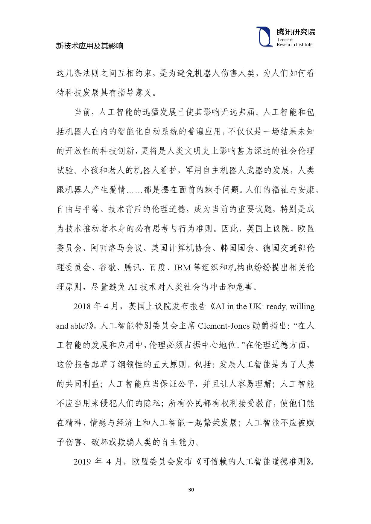 2018年 4 月,英国上议院发布报告《AI in the UK: ready, willing and able?》,人工智能特别委员会主席 Clement-Jones 勋爵指出:“在人 工智能的发展和应用中,伦理必须占据中心地位。”在伦理道德方面, 这份报告起草了纲领性的五大原则,包括:发展人工智能是为了人类 的共同利益;人工智能应当保证公平,并且让人容易理解;人工智能 不应当用来侵犯人们的隐私;所有公民都有权利接受教育,使他们能 在精神、情感与经济上和人工智能一起繁荣发展;人工智能不应被赋 予伤害、破坏或欺骗人类的自主能力。