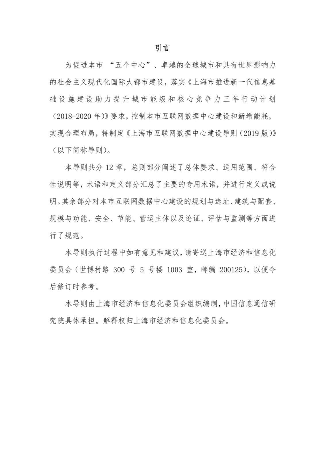 为落实《上海市推进新一代信息基础设施建设助力提升城市能级和核心竞争力三年行动计划(2018-2020年)》关于加强互联网数据中心合理布局和统筹建设的相关要求,按照“满足必需,总量最小”的调控方向,坚持“应用服务高端、新增规模严控、资源利用高效”的导向,在规划与选址、建筑与配套、规模与功能、安全、节能、营运主体以及论证、评估与监测等方面规范本市互联网数据中心建设,我委组织编制了《上海市互联网数据中心建设导则(2019版)》,现印发给你们,请参照执行。