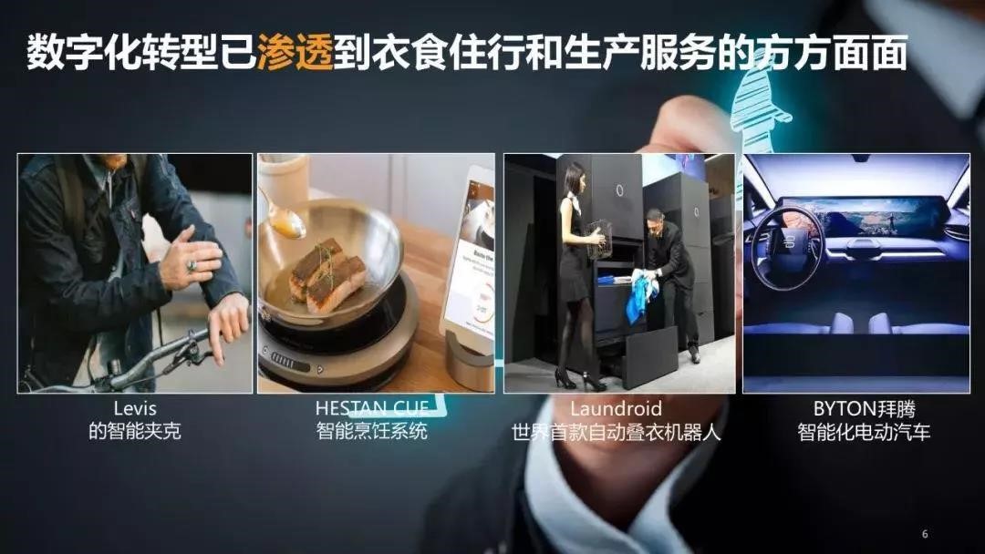 数字化转型已经渗透到衣食住行和生产服务的方方面面,如智能可穿戴设备、智能烹饪系统、自动又叠衣机、智能化电动汽车等。