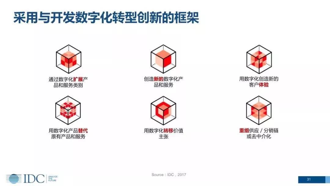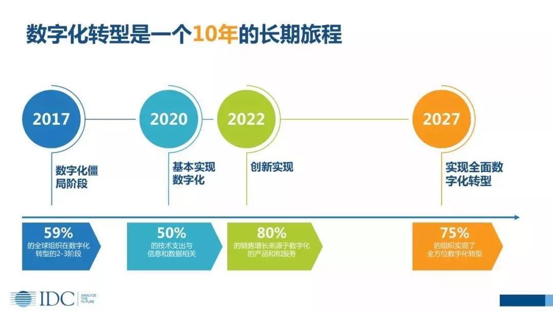 数字化转型是一个10年左右长期旅程,2017年全球59%企业处在数字化转型的第二、三阶段,也是属于一个爬坡阶段,再往上走难度越来越大;到2020年基本实现数字化,50%的技术支出会与信息和数据相关;到2022年80%的销售增长将来源于数字化的产品和服务,数字化必然在最后覆盖的仅仅是企业的业务环节,而是整个企业。