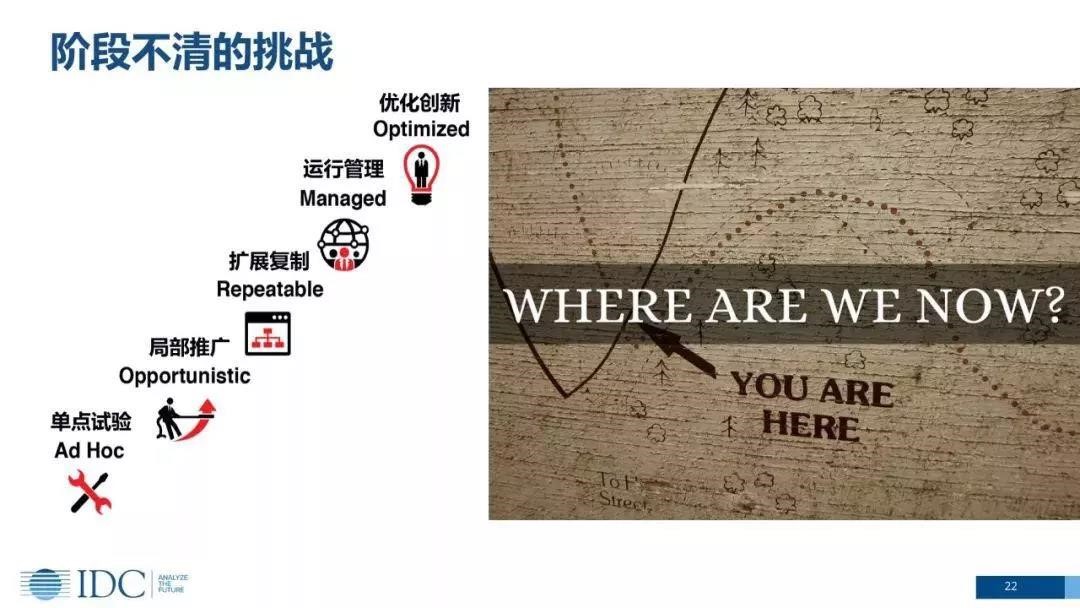许多企业不清楚自己数字化转型的阶段,因此很难在市场占得先机。IDC把数字化转型分为一个阶段:单点试验、局部推广、扩展复制、运行管理、优化创新。