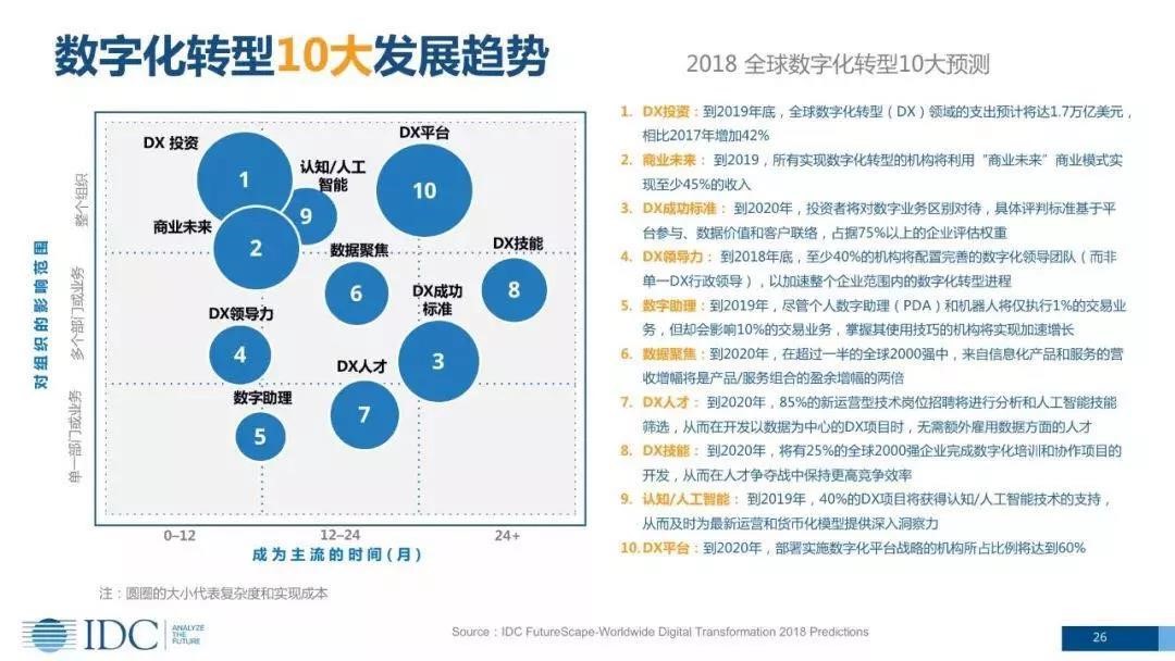 基于这些挑战,IDC预测了2018年全球数字化转型的10大趋势。下图中圈越大越难,越靠上影响面越大,越靠右成为主流的时间越长,主要包括:DX投资、商业未来、DX成功标准、DX领导力、数字助理、数字聚集、DX人才、认知/人工智能、DX平台。