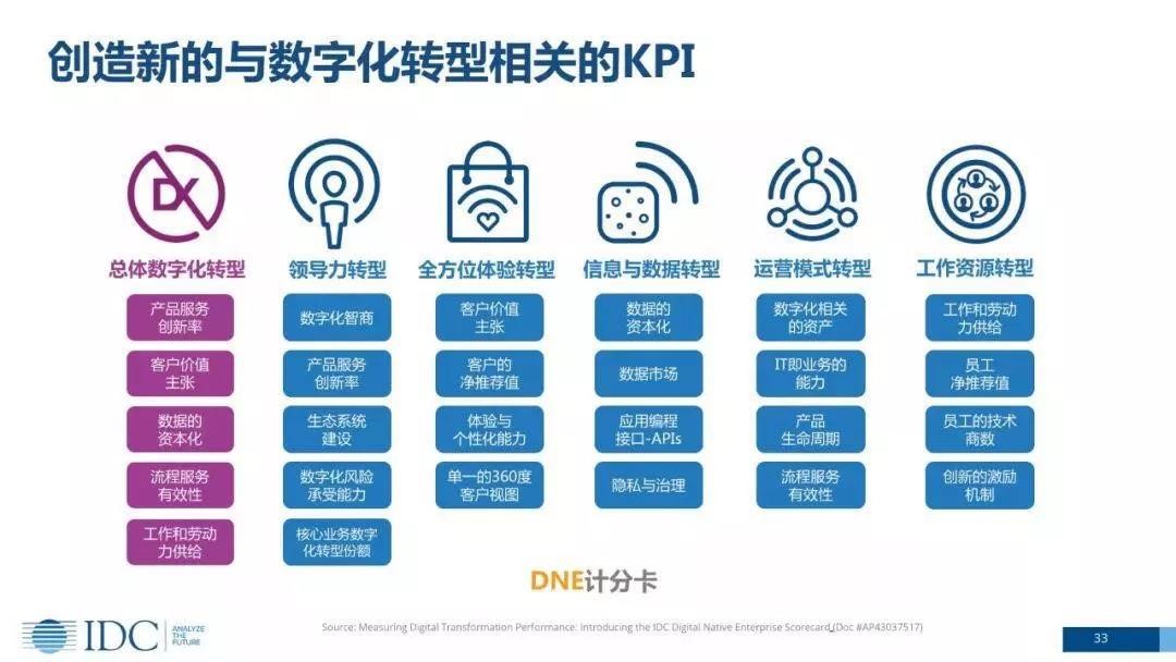 前面提到一个陈旧的KPI是数字化转型的挑战,IDC就五大方面提出了一些数字化转型的指标:领导力转型、全方位体验转型、信息与数字转型、运营模式转型、工作资源转型。