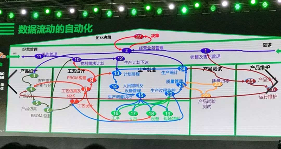 后来我想了很长的时间,我说自动化有两种,一种是看得见的自动化,我们的机器人、各种各样的先进的设备、数控机床、AGV 小车、立体仓库,这个是物理世界。还有一种自动化是看不见的,就是数据如何在企业内部自动的流动,当我们了解了采集了客户需求的信息之后,这个信息就在企业内部的研发设计、物流配送的每一个环节去流动,这些信息不断被加工、处理、执行,在这个过程中,能够把正确的数据在正确的时间以正确的方式传递给正确的人和机器,我们采集了客户的需求信息,这个信息就在你的经营管理、产品设计、工艺设计、生产制造、产品测试、产品维护的每一个环节去流动。