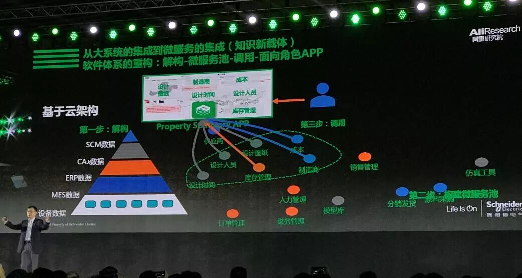 我们的一个汽车需要召回,我们过去在原有的系统里面去找,谁生产的,库存有多少,谁设计的,价格是多少,需要一个个的系统去打开,那我们今天把原有的这些来自于供应链管理 CAD、ERP 的数据不断地用软件去解构和分解之后,重新构建一个面向角色、面向场景的一个 APP,就面对这样一个召回可以形成一个APP。