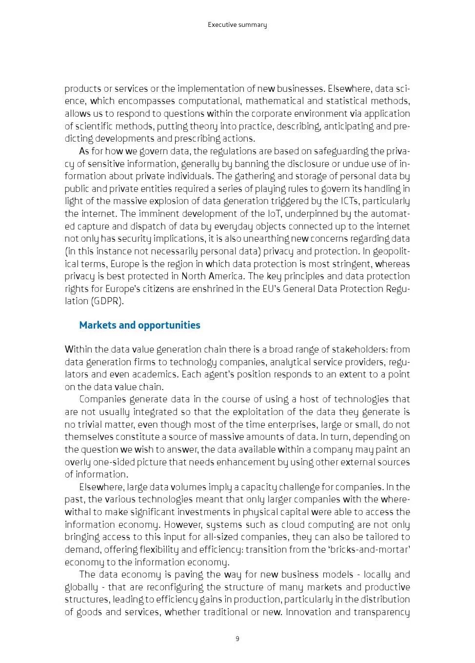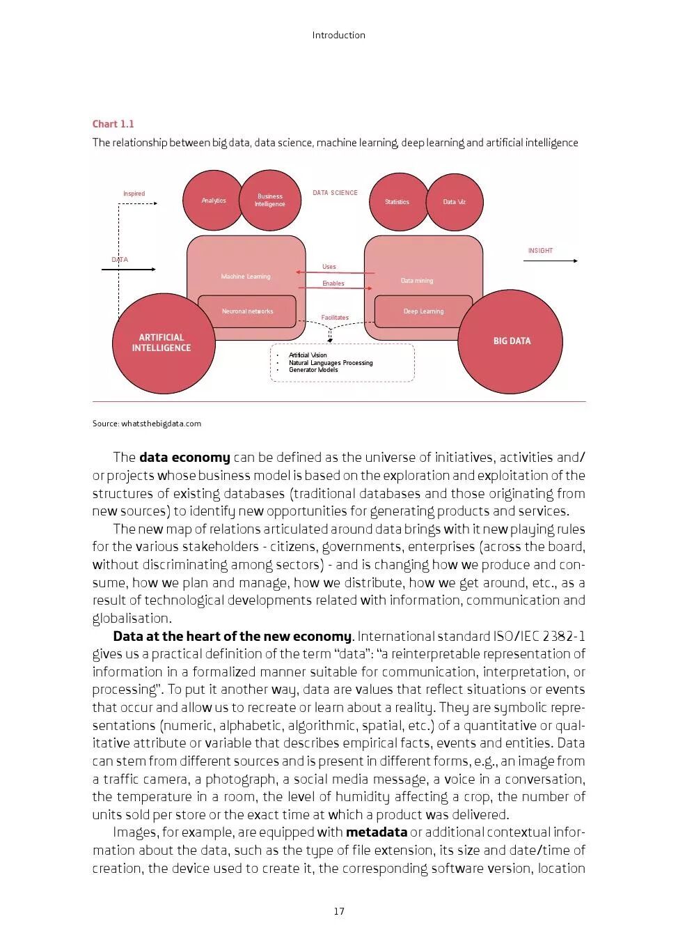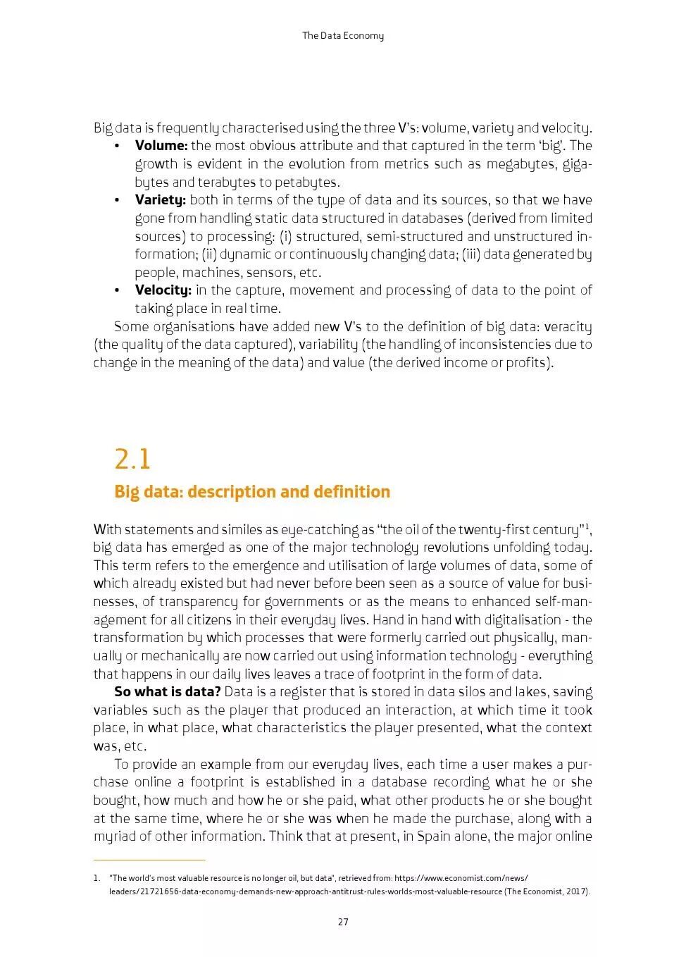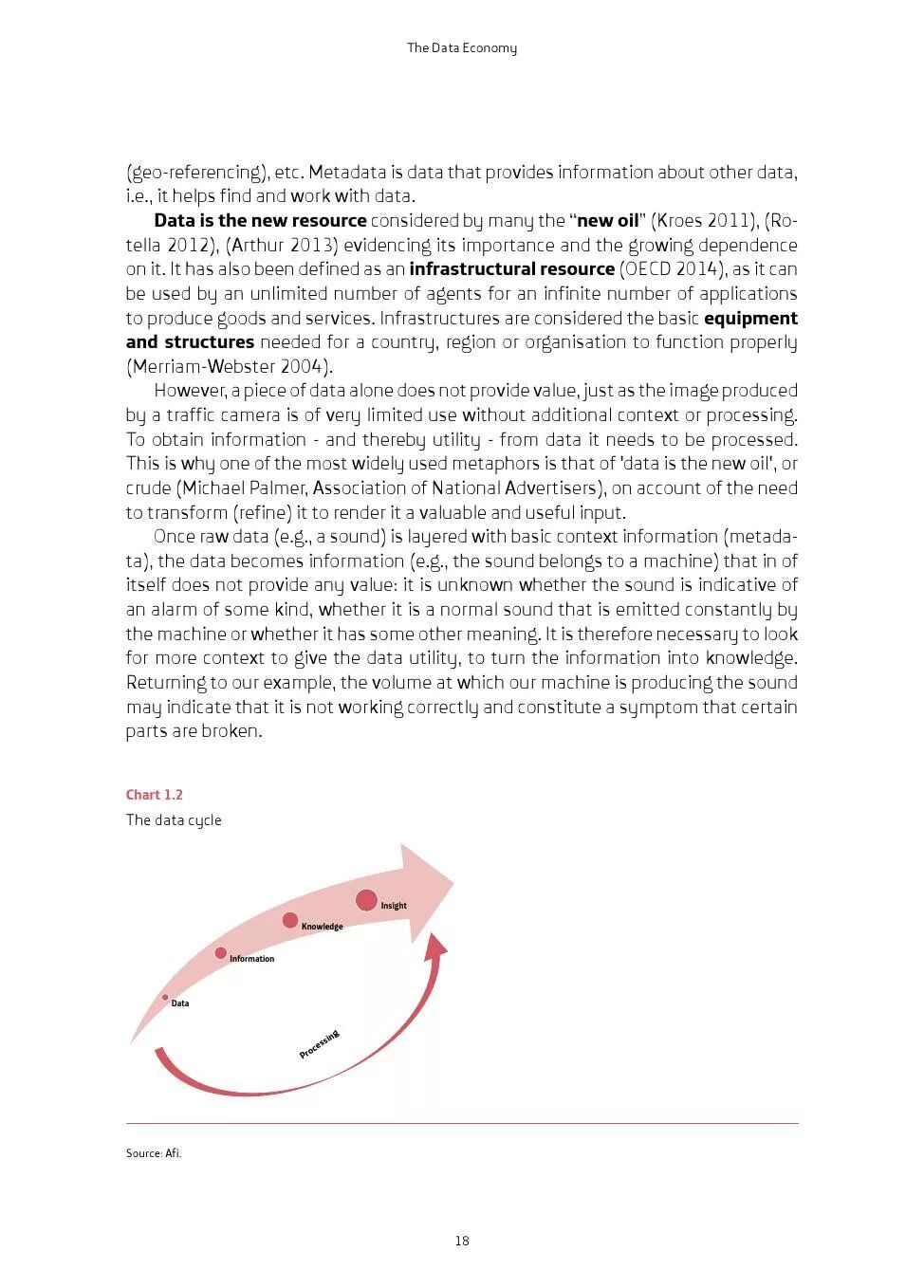 数据是新经济的核心。国际标准ISO / IEC 2382-1提供了“数据”一词的实际定义:“以合适的通信、处理方式重新解释信息”。数据是描述经验事实的定量或定性的符号表示(数字、字母、算法、空间等)。数据可以来自不同的来源并且以不同的形式呈现,例如来自交通摄像机的图像、个人照片、社交媒体消息、对话中的声音、房间中的温度、影响作物的湿度水平、每家商店销售的产品数量或产品交付的确切时间。