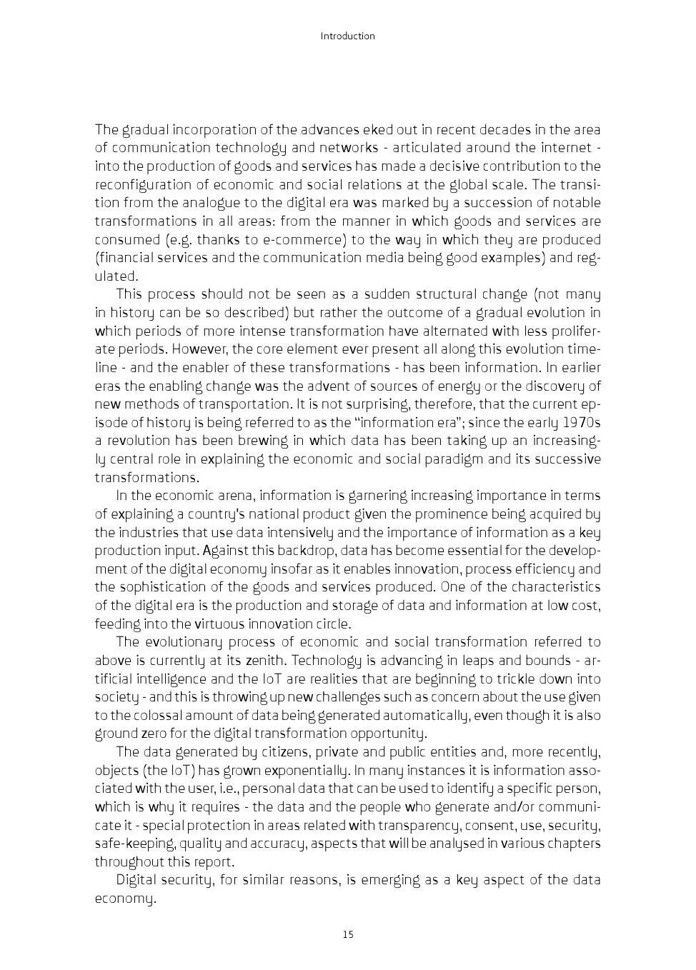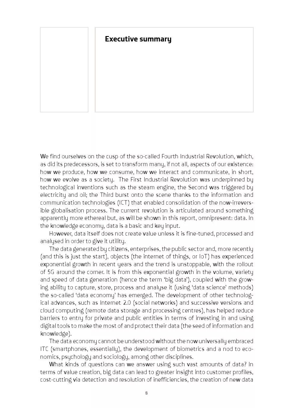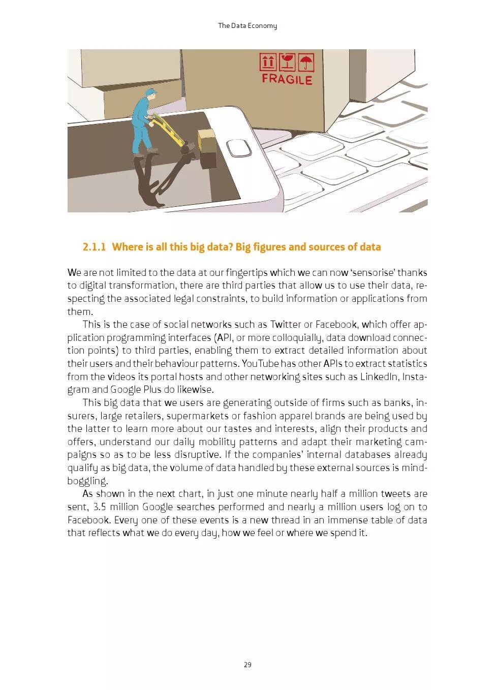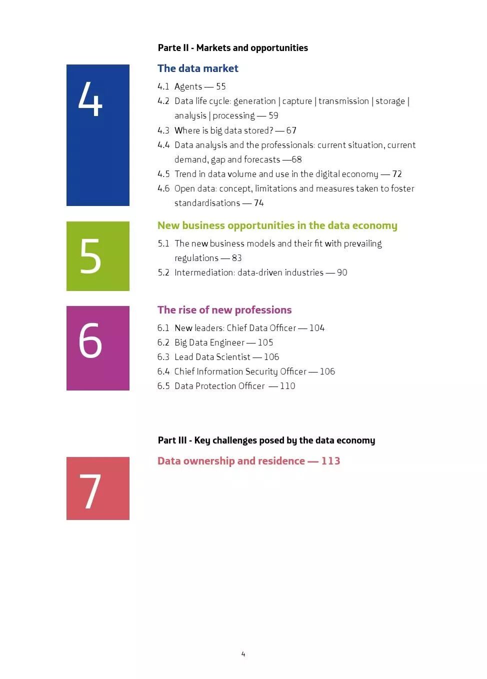 数据是新经济的核心。国际标准ISO / IEC 2382-1提供了“数据”一词的实际定义:“以合适的通信、处理方式重新解释信息”。数据是描述经验事实的定量或定性的符号表示(数字、字母、算法、空间等)。数据可以来自不同的来源并且以不同的形式呈现,例如来自交通摄像机的图像、个人照片、社交媒体消息、对话中的声音、房间中的温度、影响作物的湿度水平、每家商店销售的产品数量或产品交付的确切时间。