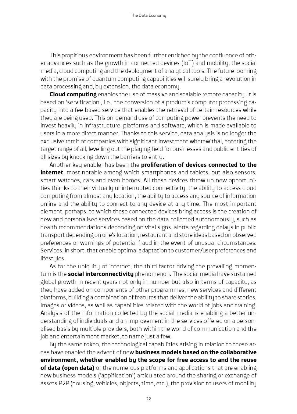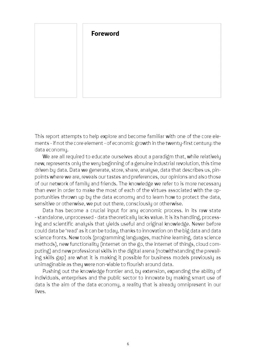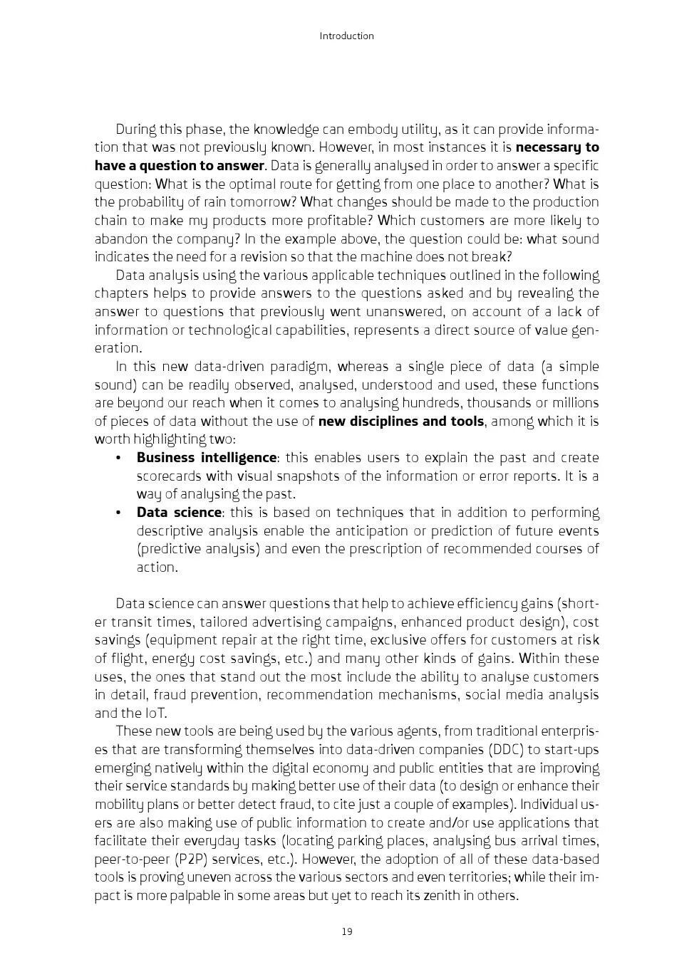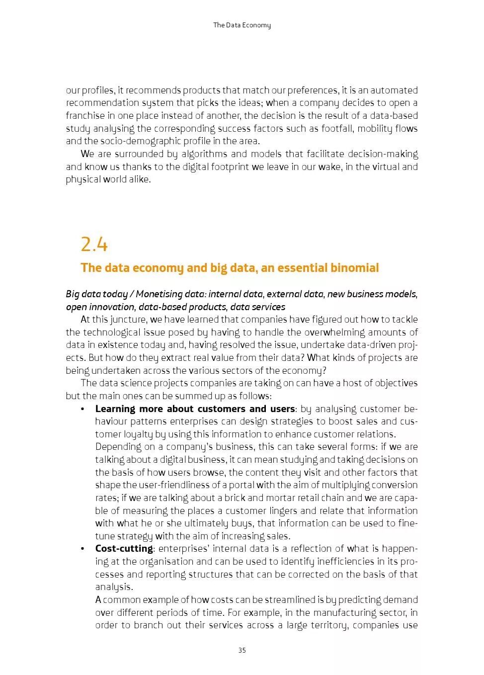 数据是新经济的核心。国际标准ISO / IEC 2382-1提供了“数据”一词的实际定义:“以合适的通信、处理方式重新解释信息”。数据是描述经验事实的定量或定性的符号表示(数字、字母、算法、空间等)。数据可以来自不同的来源并且以不同的形式呈现,例如来自交通摄像机的图像、个人照片、社交媒体消息、对话中的声音、房间中的温度、影响作物的湿度水平、每家商店销售的产品数量或产品交付的确切时间。