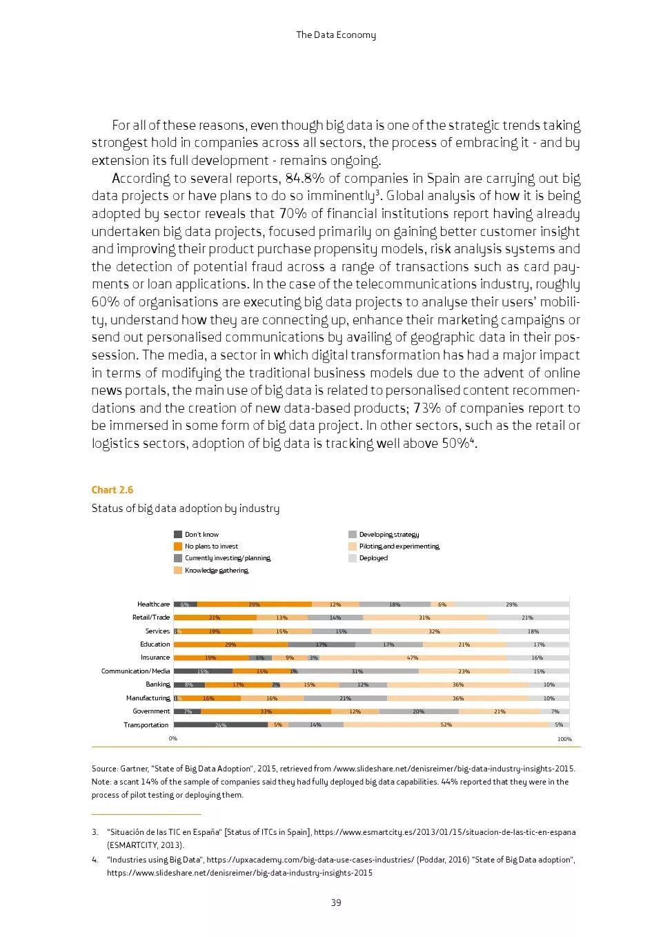根据几份报告,西班牙84.8%的公司正在采用大数据,或计划立即采用大数据。在全球范围内,70%的金融机构报告已经采用了大数据技术。就电信行业而言,大约60%的组织正在采用大数据。在其他行业,如零售或物流行业,大数据的采用率远高于50%。