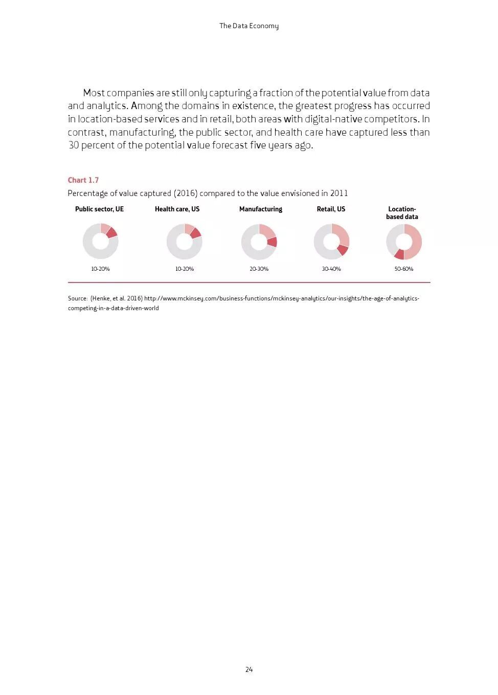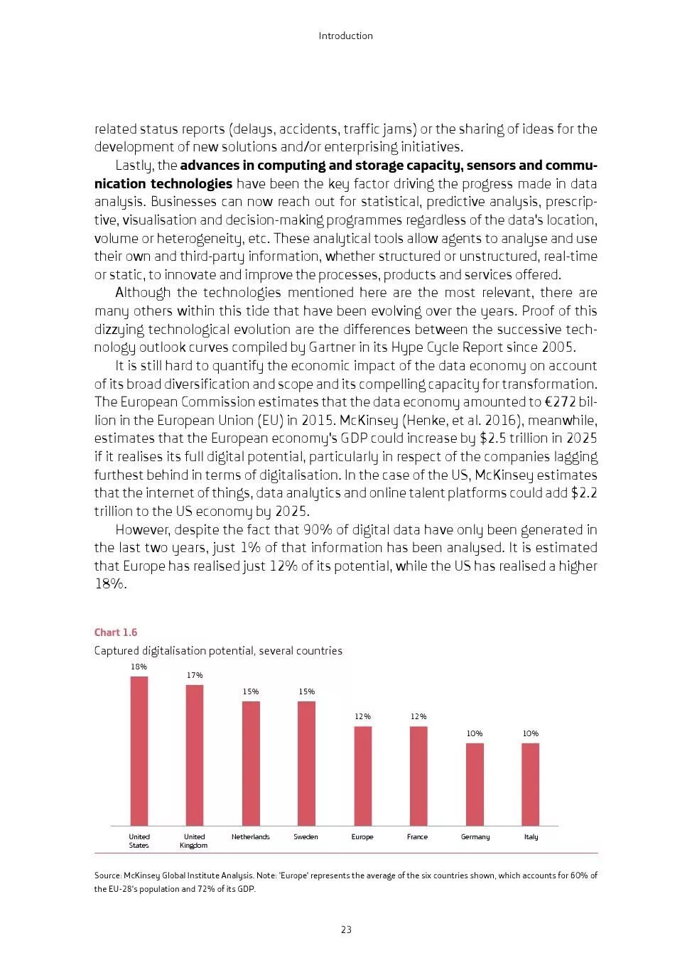 欧盟委员会估计,2015年欧盟(EU)的数据经济达到272亿欧元。麦肯锡2016年估计,2025年欧洲数据经济的国内生产总值可能增加2.5万亿美元。就美国而言,麦肯锡估计,到2025年,物联网、数据分析和在线人才平台可能会为美国经济带来2.2万亿美元GDP。