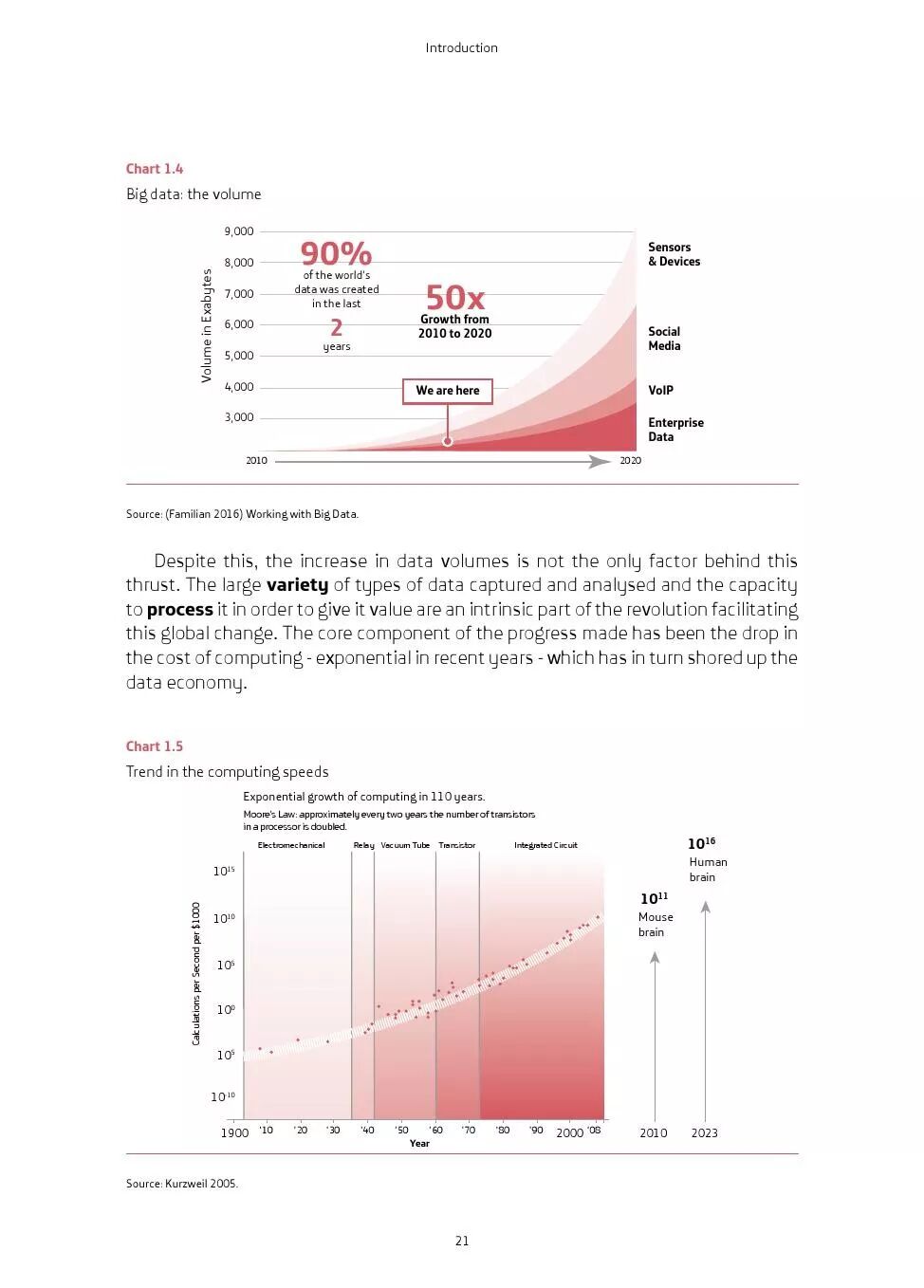 数据经济崛起最核心因素之一是数据资源量的增长。据软件和信息产业协会(SIIA 2013)称,2013年全球每年存储的数据资源量为161艾字节(1 EB = 1018字节),高于2003年的5 EB。到2020年全球数据中心流量预计将超过15个zettabytes(1 ZB = 1021字节)。
