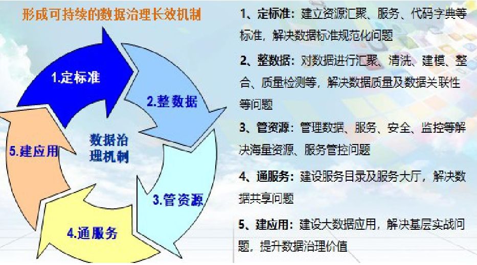 要解决这些问题,数据治理势在必行。数据治理不单是一个方法、也不是一个功能、也不是一个工具,而是一整套体系。数据治理核心领域功能不再是人工处理,而是全流程平台化,比如数据服务、数据质量、模型、数据标准;同时配套相应的组织架构、人员方案,通过考核机制、管控办法等制度章程予以约束和协调各部门在数据治理中的角色和要求;除了平台工具、保障措施之外,还必须有实施流程和技术的支撑,比如政务云的资源设施及各单位数据接入流程等。所以数据治理是平台工具、方法论和保障机制的有机体,不可分割。整个体系的重点、难点在于数据服务、数据模型和数据标准化实施。