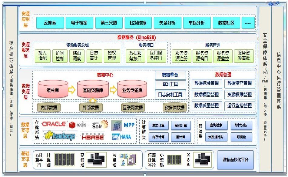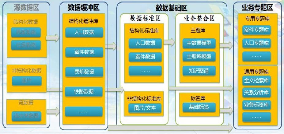 (1)源数据区,是数据中心汇聚的基础,包括各政府单位的业务数据,以结构化数据为主体,也包括非结构化数据和流式数据。