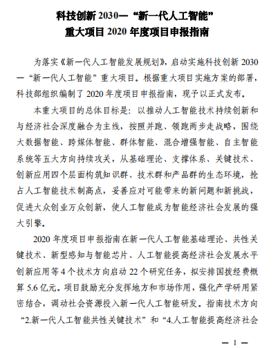 为落实国务院印发的《新一代人工智能发展规划》的总体部署,现根据《新一代人工智能重大科技项目实施方案》启动实施科技创新2030—“新一代人工智能”重大项目。按照《关于深化中央财政科技计划(专项、基金等)管理改革的方案》(国发﹝2014﹞64号)的相关要求,将2020年度项目申报指南予以公布。请按照指南要求组织项目申报工作。有关事项通知如下。