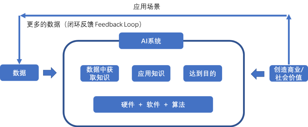 AI驱动商业创新,必须依赖于具体的应用场景,才能更大程度地提升效率,在AI系统中,通过数据获取知识,数据不是无中生有,它永远产生于对环境的观察,必须有传感器,再从数据中抽取知识,通过软件+硬件+算法来应用知识,进而达到该场景下的商业目的,创造社会价值,形成价值闭环,以上模式是任何AI创造价值必须遵守的规则。