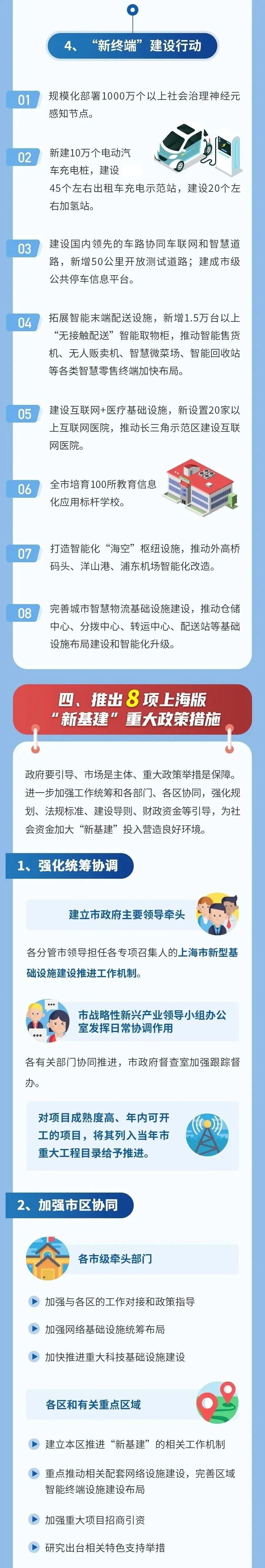 4、“新终端”建设行动。围绕培育新经济、壮大新消费等需求,加快推动商贸、交通、物流、医疗、教育等终端基础设施智能化改造。主要包括:规模化部署千万级社会治理神经元感知节点;新建10万个电动汽车充电桩;建设国内领先的车路协同车联网和智慧道路;建成市级公共停车信息平台;拓展智能末端配送设施,推动智能售货机、无人贩卖机、智慧微菜场、智能回收站等各类智慧零售终端加快布局;建设互联网+医疗基础设施;培育教育信息化应用标杆学校;打造智能化“海空”枢纽设施;完善城市智慧物流基础设施建设。