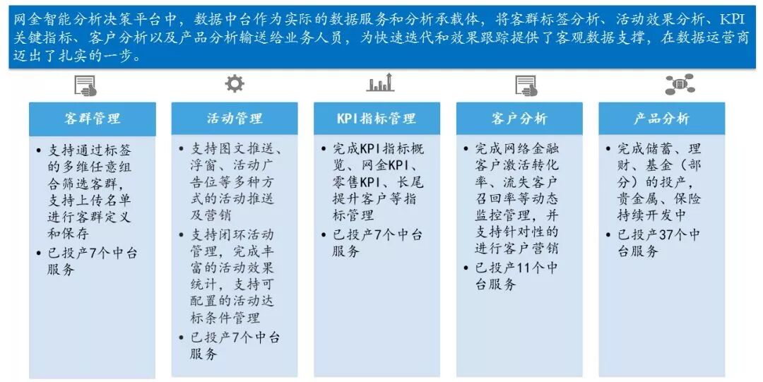 在数据中台的支撑下,网金数字化运营平台打通了管理驾驶舱和线上服务平台的数据链路,使经营管理决策、策略投放执行、效果评估反馈、迭代完善优化等环节能够闭环执行。