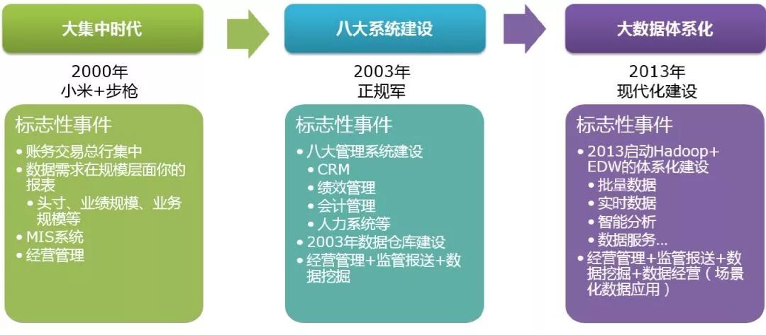我行数据体系演进经历了三个阶段:信息分散阶段、数据仓库阶段和大数据平台化阶段,受到经营模式、组织架构、技术条件等诸多因素影响,不同阶段在数据层面会表现出不同的应用模式: