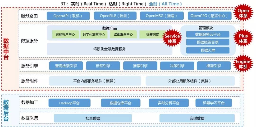 银行业的数据中台建设,在前台业务系统和后台数据系统之间构建了一条数据和能力的通道,为前台的业务团队、客户经理、财富顾问与后台的数据专家、算法模型专家、人工智能专家的工作衔接形成一条强有力的支撑纽带,业务团队专注于产品的具体逻辑与业务管理流程,数据专家专注于加速从数据到价值的过程,提高对业务的响应能力。这样一个快速通道、纽带,为商业银行的数据体系注入了新的活力。
