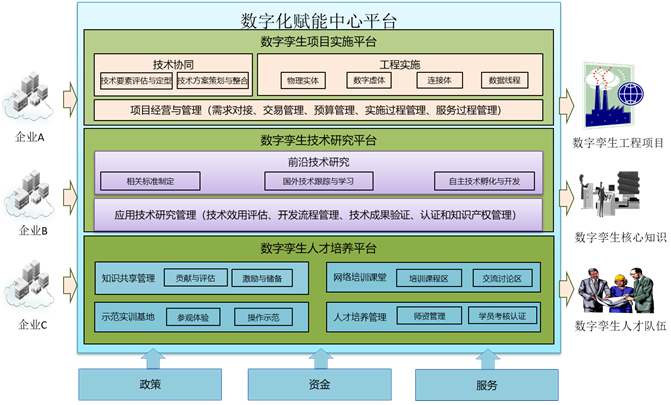 每个业态的数字化转型赋能中心负责本业态的数字孪生体发展规划、技术研发、重大工程实施、软硬件基础设施和公共库建设、人才培养和工程队伍孵化、标准体系和示范中心建设等,并组建本业态的数字化转型国家智库。