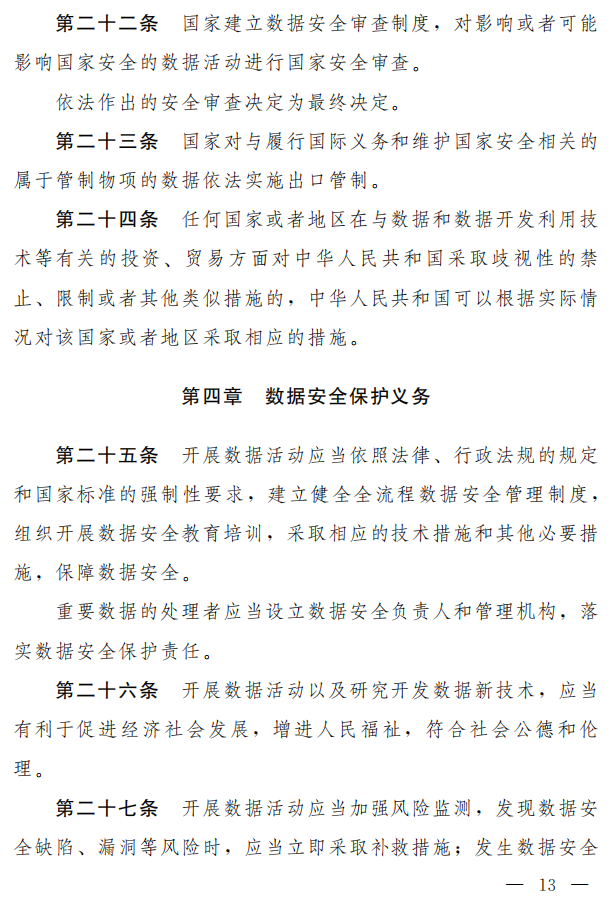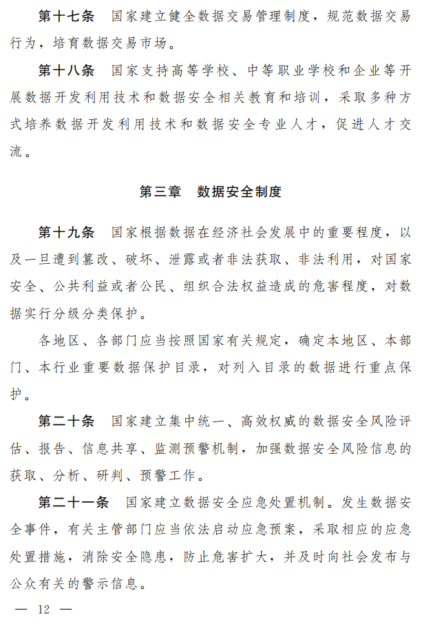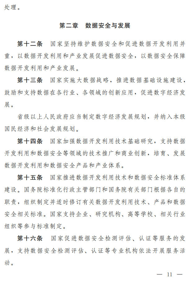 草案坚持安全与发展并重,设专章对支持促进数据安全与发展的措施作了规定,保护个人、组织与数据有关的权益,提升数据安全治理和数据开发利用水平,促进以数据为关键要素的数字经济发展。包括:实施大数据战略,制定数字经济发展规划;支持数据相关技术研发和商业创新;推进数据相关标准体系建设,促进数据安全检测评估、认证等服务的发展;培育数据交易市场;支持采取多种方式培养专业人才等。(草案第十二条至第十八条)