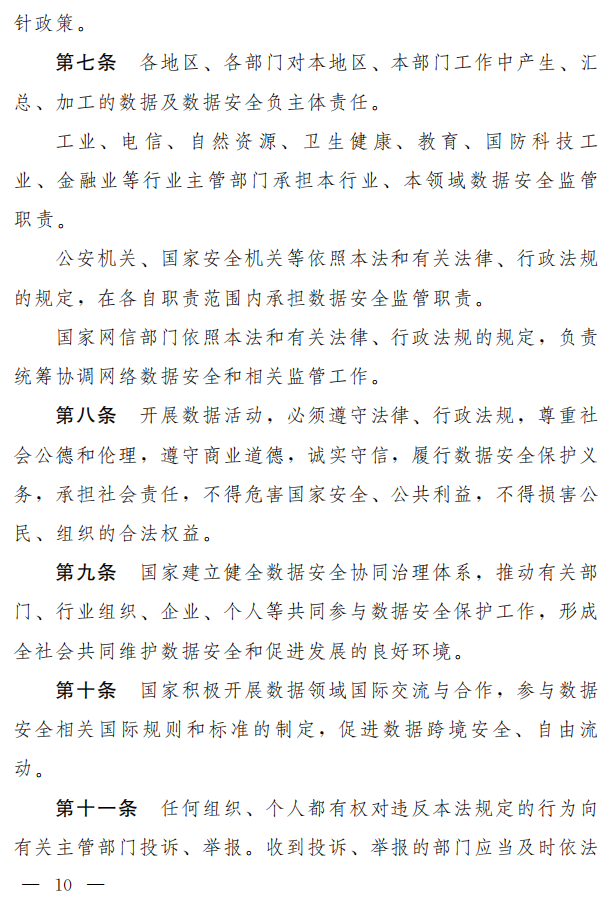 数据安全涉及各行业各领域,涉及多个部门的职责,草案明确中央国家安全领导机构对数据安全工作的决策和统筹协调等职责,加强对数据安全工作的组织领导;同时对有关行业部门和有关主管部门的数据安全监管职责作了规定。(草案第六条、第七条)