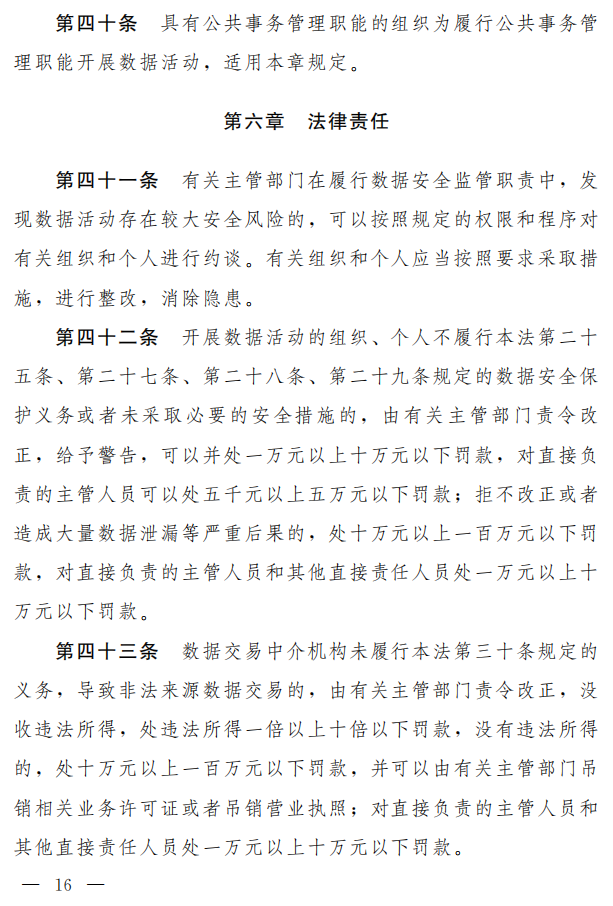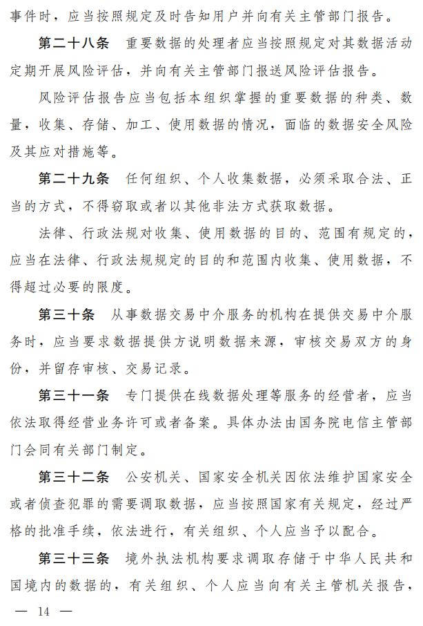 保障数据安全,关键是要落实开展数据活动的组织、个人的主体责任。对此,草案主要作了以下规定:一是,开展数据活动必须遵守法律法规,尊重社会公德和伦理,有利于促进经济社会发展,增进人民福祉,不得违法收集、使用数据,不得危害国家安全、公共利益,不得损害公民、组织的合法权益(草案第八条、第二十六条、第二十九条)。二是,开展数据活动应当按照规定建立健全全流程数据安全管理制度,组织开展数据安全教育培训,采取相应的技术措施和其他必要措施,保障数据安全(草案第二十五条)。三是,开展数据活动应当加强数据安全风险监测、定期开展风险评估,及时处置数据安全事件,并履行相应的报告义务(草案第二十七条、第二十八条)。四是,对数据交易中介服务和在线数据处理服务等作出规范(草案第三十条、第三十一条)。五是,对公安机关和国家安全机关因依法履行职责需要调取数据以及境外执法机构调取境内数据时,有关组织和个人的相关义务作了规定(草案第三十二条、第三十三条)。