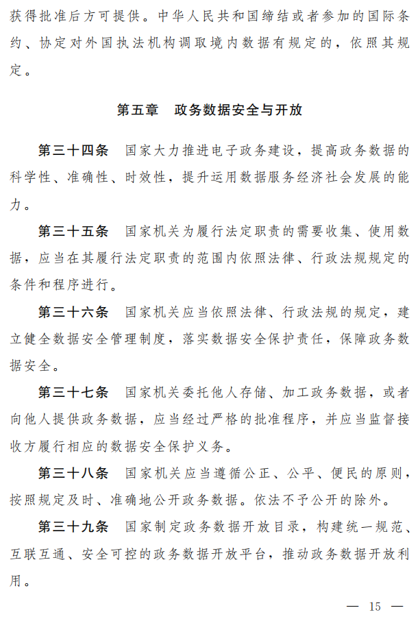 为保障政务数据安全,并推动政务数据开放利用,草案主要作了以下规定:一是,对推进电子政务建设,提升运用数据服务经济社会发展的能力提出要求(草案第三十四条)。二是,规定国家机关收集、使用数据应当在其履行法定职责的范围内依照法律、行政法规规定的条件和程序进行,并落实数据安全保护责任,保障政务数据安全(草案第三十五条、第三十六条)。三是,对国家机关委托他人存储、加工或者向他人提供政务数据的审批要求和监督义务作出规定(草案第三十七条)。四是,要求国家机关按照规定及时准确公开政务数据,制定政务数据开放目录,构建政务数据开放平台,推动政务数据开放利用(草案第三十八条、第三十九条)。