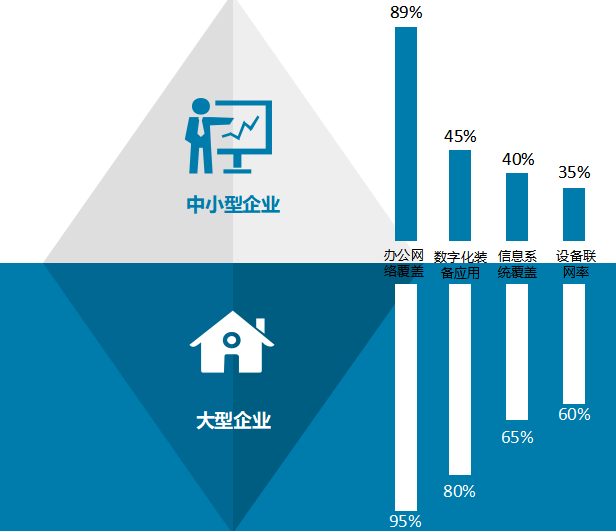 二是资源投入不足。根据数据统计,当前中小企业办公网络平均覆盖率到89%,而关键工序的数字化装备应用比例为45%,设备联网率为35%,生产过程信息系统覆盖占比为40%。中小企业在网络、设备、信息系统等资源配置方面投入对比大型企业资源投入相对不足。