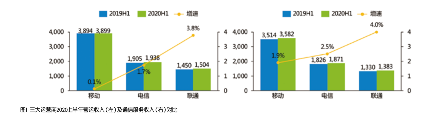 2020年上半年3家运营商收入均保持正增长,在全国GDP增速下降1.6%的经济下行大背景下,这样的表现体现出了电信运营商在经济下行时的韧性。在稳中求进的总基调下,稳定的基本盘为电信运营商的转型发展奠定了基础。从具体数值来看,中国移动营运收入达到3899亿元,同比微涨0.1%,通信服务收入为3582亿元,同比增长1.9%,增速虽为3家运营商最低但收入的增量绝对值是最大,“大象”能够继续跑出如此速度实属不易;中国电信营运收入达到1938亿元,同比增长1.7%,通信服务收入为1871亿元,同比增长2.5%,保持了稳定发展态势;中国联通营运收入达到1504亿元,同比增长3.8%,通信服务收入为1383亿元,同比增长4%,在价值经营的导向下保持了较好增长。三大运营商2020上半年营运收入及通信服务收入对比如图1所示。