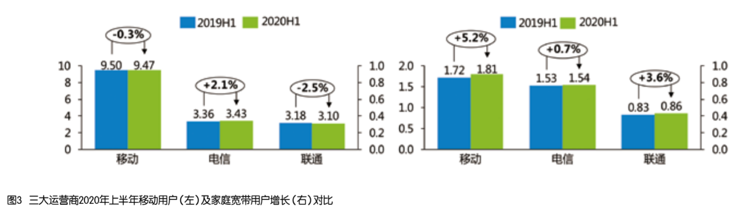 在家庭市场方面,规模持续增长,ARPU值稳步提升。3家运营商在2020年上半年均实现了家宽用户规模的持续增长,中国移动达到1.81亿户,中国电信达到1.53亿户,中国联通达到0.86亿户,中国移动在家庭市场仍保持快速发展势头,家宽用户份额的第一地位持续稳固。随着智能组网、智慧家庭、家庭云等智慧家庭生态的持续推进,3家运营商的家宽综合ARPU均有所提升,中国移动家宽综合ARPU提升到35.3元,同比增长1%;中国电信宽带综合ARPU提升到44.2元,较去年下半年提升8.1%,回升至去年同期水平,智慧家庭价值贡献显著提升;中国联通宽带接入ARPU提升至43元,同比提升2.9%。三大运营商2020年上半年移动用户及家庭宽带用户增长对比如图3所示。