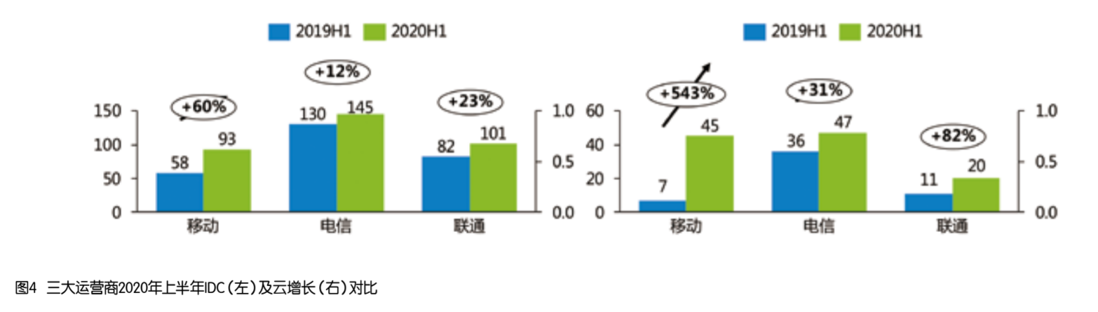面向经济社会在线化、云化、智能化的需求,运营商加快从通信服务向信息服务的转变。中国移动将政企市场视为新“蓝海”,持续推进“网+云+DICT”业务发展,DICT业务收入达到209亿元,同比增长55.3%;中国电信紧抓经济社会数字化转型趋势,产业数字化收入规模达到429亿元,同比增长5.1%;中国联通产业互联网收入达到227亿元,同比增长36%,占主营业务收入比重提高至16%。其中,如将IDC和云的收入对比来看,中国移动2020年上半年保持快速增长,IDC收入达到93亿元,同比增长60%,云收入达到45亿元,同比增长543%,已经超过中国联通;中国电信规模上持续保持领先态势,IDC收入突破145亿元,同比增长12%,云收入突破47亿元,同比增长31%;中国联通IDC收入达到101亿元,同比增长23%,云收入达到20亿元,同比增长82%。三大运营商2020年上半年IDC及云增长对比如图4所示。