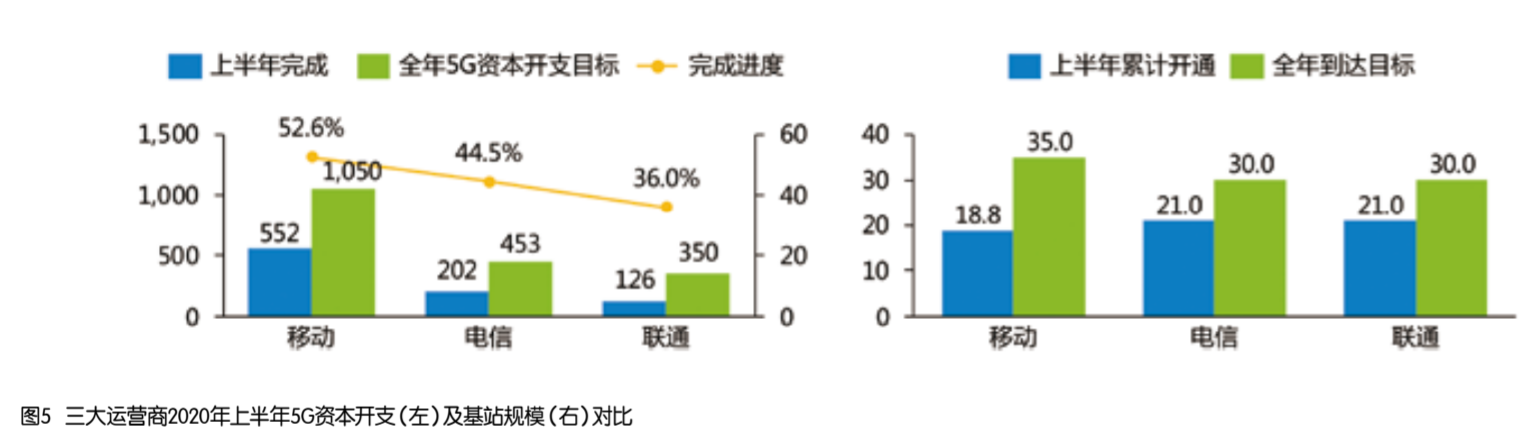 受“新基建”等政策因素影响,5G建设已进入快车道。从公布数据来看,截至2020年6月底,中国移动已建成超过18.8万座5G基站,5G基站新建目标由年初的25万座调整为30万座;5G资本开支较年初调增50亿达到1050亿元,上半年完成552亿元,进度超50%;同时与中国广电签订5G共建共享合作协议,积极谋求合作共赢。中国电信和中国联通共建共享,建成5G基站超过21万座,实现超过50个城市的5G网络覆盖;从资本开支进度来看,中国电信上半年5G资本开支202亿元,完成全年目标453亿元的44.5%,中国联通上半年5G资本开支仅为126亿元,仅完成全年350亿元目标的36%。从公开数据来看,3家运营商均将在2020年三季度前提前完成全年建设目标,5G建设按下“快进键”带动经济社会的数字化转型、智能升级和融合创新。三大运营商2020年上半年5G资本开支及基站规模对比如图5所示。