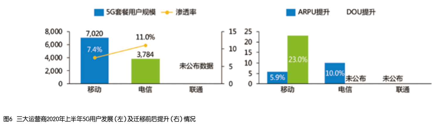 截至2020年上半年,中国移动和中国电信公布了5G套餐用户数,中国移动突破7000万户,渗透率达到7.4%;中国电信达到3784万户,渗透率达到11%,保持行业领先;中国联通仍然没有公布5G套餐用户数,表示随着网络、终端、应用的逐步成熟,下半年将加快5G用户发展。3家运营商对于5G推动价值个人市场价值回归给予厚望,中国移动坚持资费先行、终端先行,强化机套匹配,加速用户向5G迁移,推动5G量质并重发展;中国电信推进天翼超高清、云游戏、云VR等5G应用用户快速增长,拉动移动用户价值增长。三大运营商2020年上半年5G用户发展及迁移前后提升情况如图6所示。