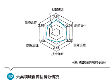 调研银行数字化能力自评估平均得分为3.01分,约半数调研银行自评估得分在3分以下。六类领域数字化能力存在一定差异,战略规划(3.47分)和业务流程(3.27分)数字化能力自评估得分相对较高,技术创新(2.45分)自评估得分相对较低,其他领域自评估得分由高到低依次为数据治理(3.03分)、组织文化(2.97分)和生态合作(2.88分)。