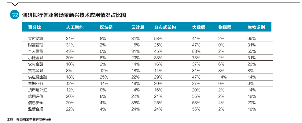 从具体业务场景看,大数据和生物识别技术应用相对比较广泛,在个人借贷、小微金融、支付结算、信用评估、监管合规等场景已得到相对较为普遍的应用。云计算技术应用相对比较普遍,在信息安全、个人借贷、支付结算等场景有所应用。人工智能技术在个人借贷、支付结算、财富管理等场景应用相对广泛。区块链技术应用处于初步阶段,在供应链金融等场景已开始从概念验证逐步迈向商业实践。物联网技术已在供应链金融、贸易金融等场景探索应用。