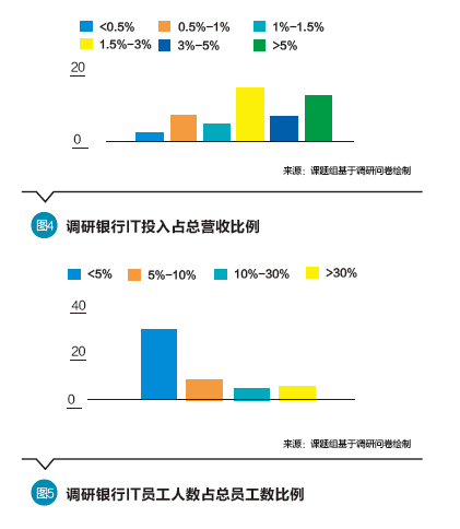 从IT员工人数占总员工数比例看,仅有6家调研银行比例大于30%,类型主要包括新型互联网银行、城市商业银行与民营银行(不含新型互联网银行),30家调研银行的比例小于5%,类型主要包括除新型互联网银行外的各类商业银行。9家调研银行比例在5%~10%,5家调研银行比例在10%~30%。