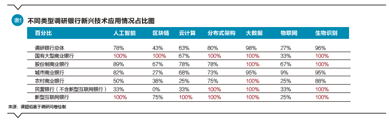 从总体应用情况看,大数据和生物识别技术在调研银行应用相对广泛,占全部调研银行的比例分别为98%和96%。区块链与物联网技术应用占比相对较小,但也有多家银行开始应用探索。国有大型商业银行和新型互联网银行应用新兴技术相对积极,农村商业银行和民营银行(不含新型互联网银行)新兴技术应用相对较少。