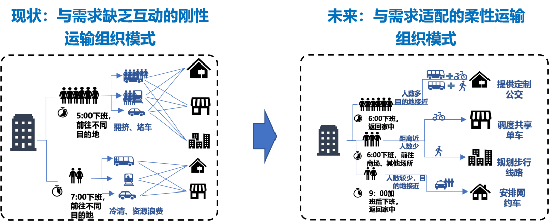一体化无断链的出行体验、与需求互动的柔性运输组织模式、基于预约出行的高效交通资源配置。