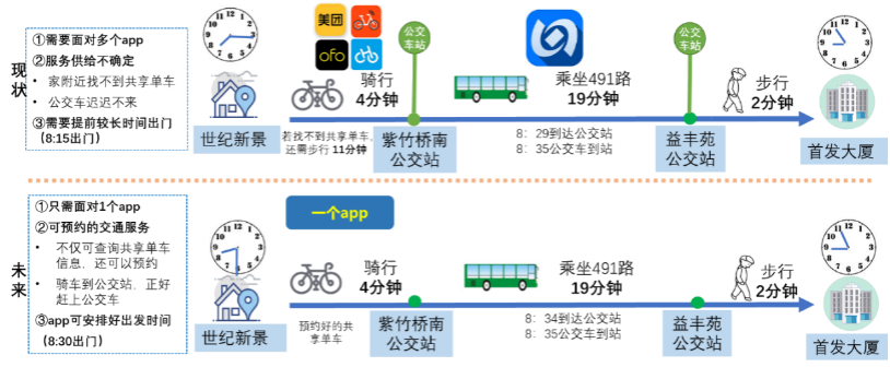 数字经济下,将产生新的交通供需关系组织者,实现各种出行方式在信息、服务、支付方面的一体化,以及基于全出行链条的服务可得性、换乘高效性和时间确定性。未来的出行场景可能变成这样:人们出行时,不再需要去面对各种各样的app和交通工具,只需要通过一个app或一个平台,就能够实现一体化无断链的超高出行体验。例如从家到单位,涉及到两端自行车接驳和中途乘坐公共交通,只需要在app上输入出发地和目的地、希望到达目的地的时间、可接受的价格等个人偏好,平台上就会给出一个完整的解决方法:什么时间从家出发,步行到家附近特定位置会有一辆预约好的共享单车在那等候,骑行至公交站点附近后,即可赶上公交车,到站后步行至单位,正好在希望的时间内到达目的地。整个行程涉及的骑行费用和公交费用只需一键支付,真正满足人们“一体化、无断链”的出行体验。