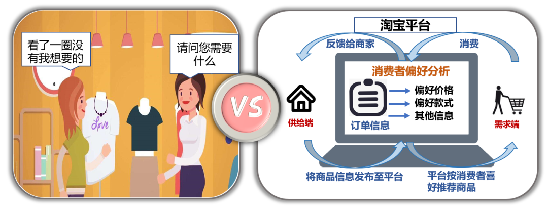 淘宝平台出现之前,传统的销售模式都是通过固定的经营场所和固定的经营时间进行“门店式”的实体营销,而消费者也只能到门店进行购买商品。在此之前,销售者无法知道消费者的喜好,而消费者也不清楚门店是否有所喜欢的产品,而且由于从消费端到产品制造端往往是单向链条,信息传导较慢,难以迎合消费者多变、高频、个性的需求。淘宝平台的出现,成为了零售领域新型的供需组织者,依托互联网和产消数字资源,上千万店铺同时在线服务数亿消费者,帮助产消双方围绕个性化需求进行实时的沟通和匹配。同时,融合线上线下的数据资源,还可以对消费者对于商品的偏好进行实时洞察和精准刻画,并迅速反馈到产品研发制造的供给端,实现从原来的单向产业链到以消费者为中心的环状产业协同生态的转变。